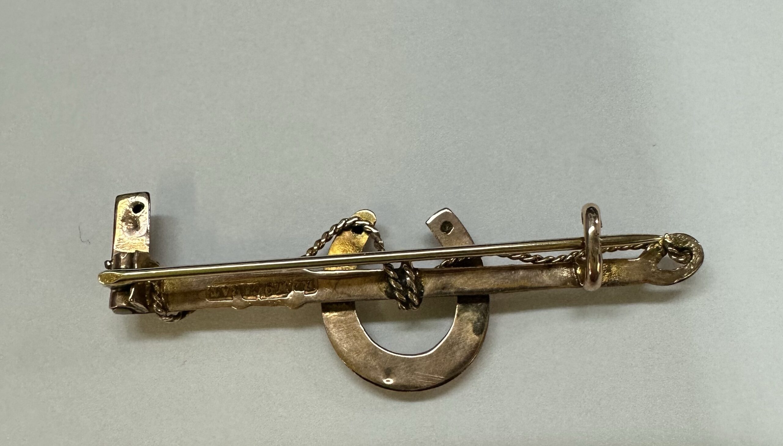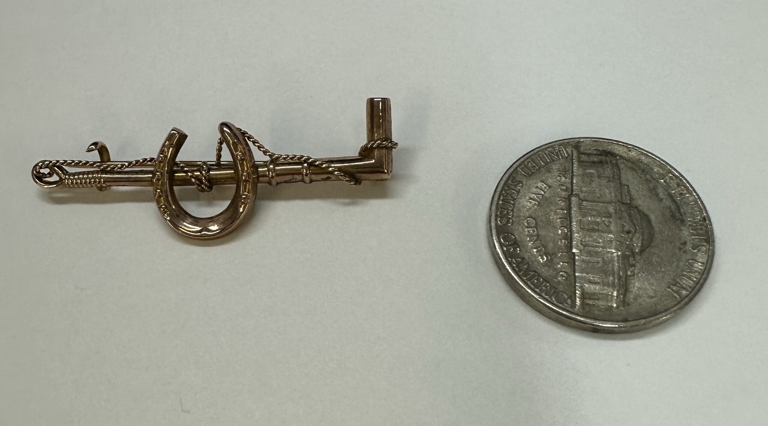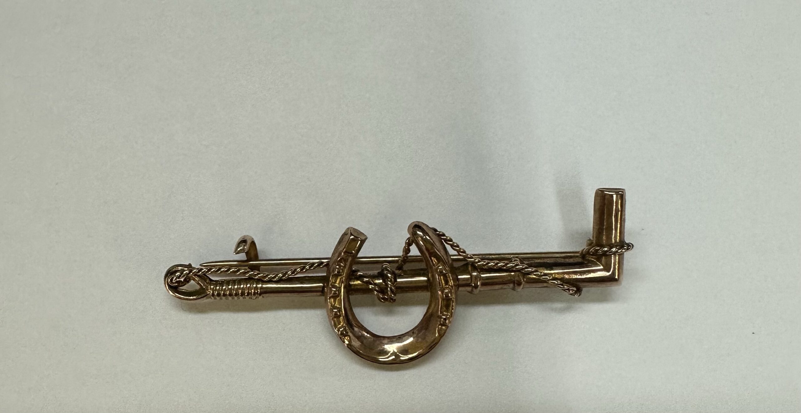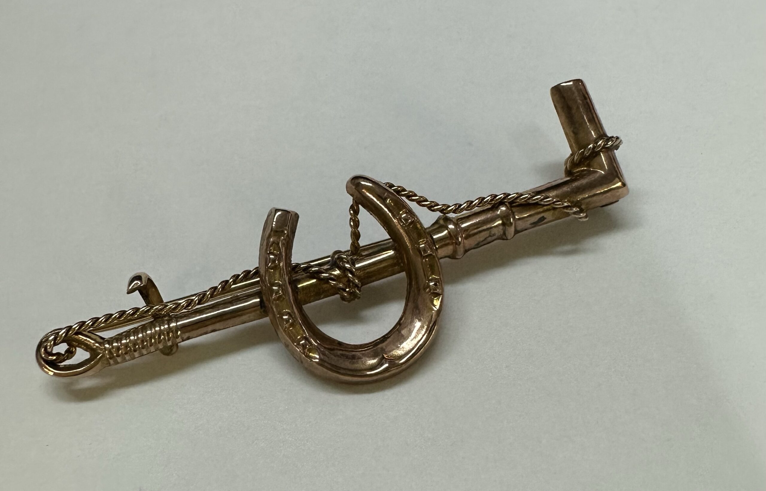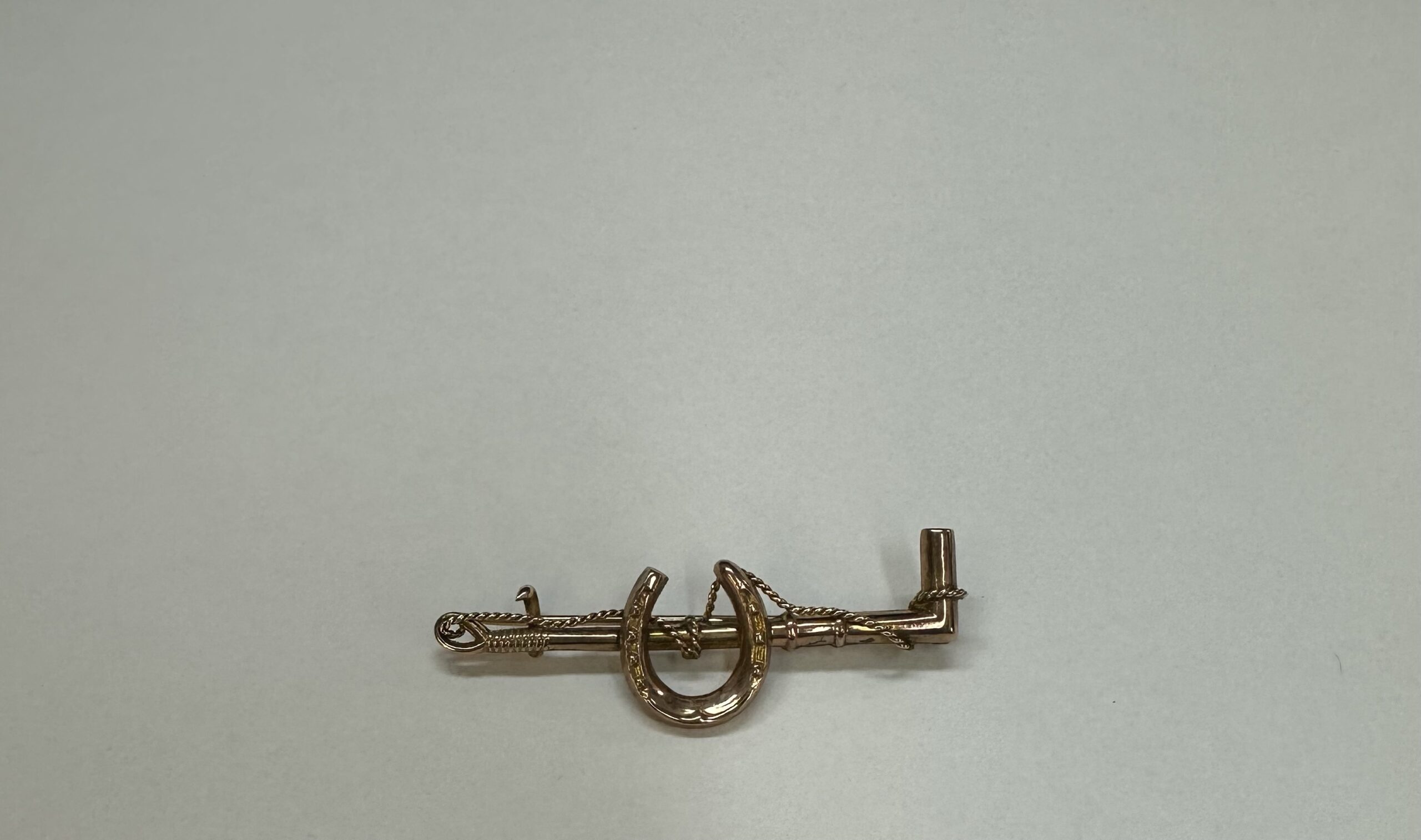 Vintage 9k rose gold horseshoe and riding crop brooch. This piece measures 1 3/4” in length and it has an entire weight of 1.5 grams.